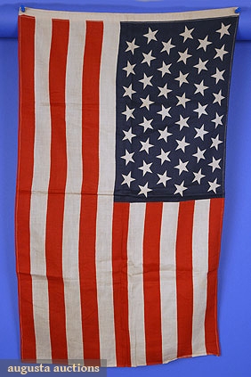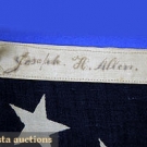 Printed cotton, 45 stars w/ hand sewn eyelets, signed Joseph A. Allen, 17" X 29.5", excellent.