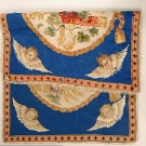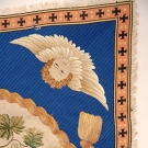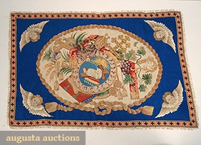 Fringed rectangle w/ oval reserve on blue ground in petit point, needlepoint, silk & wool embroidery depicting Christian symbols, 25" X 48", excellent.