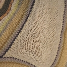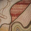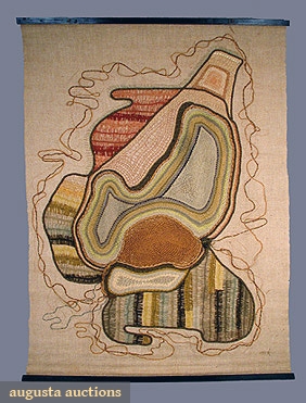 Handwoven natural linen ground, linen, wool & hemp yarns worked in embroidery, macrame, crochet & couching, signed "MK", given by the artist to her close friends, the parents of consignor, 51" X 70.5", excellent.