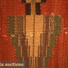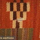 Flatwoven tapestry in brick red, green, brown, lavender, salmon, & gold, depicting in horizontal arrangement various single stem flowers in flower pots, signed w/ monogram MMF lower left, 19.5" x 26", (slight wear, small hole in field, small breaks in selvedge) good.
