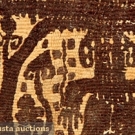 Wool and linen, approximately 5" square, woven in tapestry and sumac in shades of purple & white depicting vendage and fertility, retains good color, not examined out of frame, (small breaks and holes), overall excellent example.