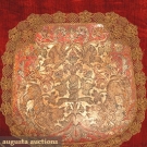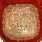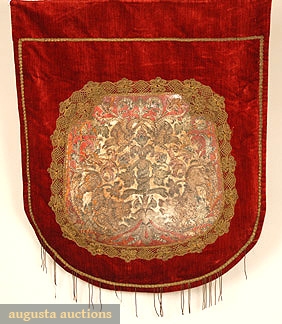Red velvet U-shaped banner w/ applied tooled & painted leather trimmed in gold galoon, fair.