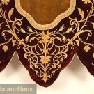 Dull gold U-shaped center w/ a wide lobed border in deep burgundy, the border decorated in heavy padded gold metallic embroidery of flowers, grapes & wheat, (gold velvet stained) good.