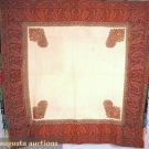 13" deep border w/ intricate tilting botehs, red w/ blue, gold, black, 2 sides w/ tabs & fringe, 60" x 62", (period mends in white ground & fabric weak) good.