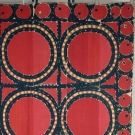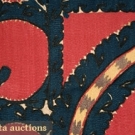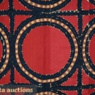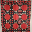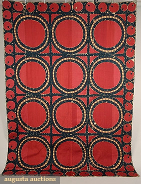 Large repeating circular medallions embroidered in navy & taupe on deep rose w/ stylized carnation border, 67" X 98", good.