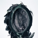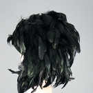 Green velvet hat covered w/ rooster-tail feathers & silver sequin bird, label "Slattery Co. Boston, Mass.", excellent.